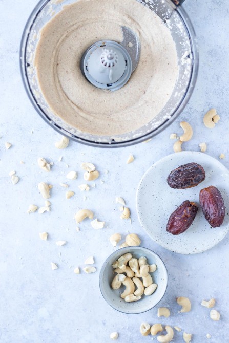 Gebe die Cashewkerne zusammen mit dem Wasser, den Medjoul-Datteln und dem Vanilleextrakt in die Küchenmaschine. 7-10 Minuten mixen, bis die Masse cremig und weich ist.