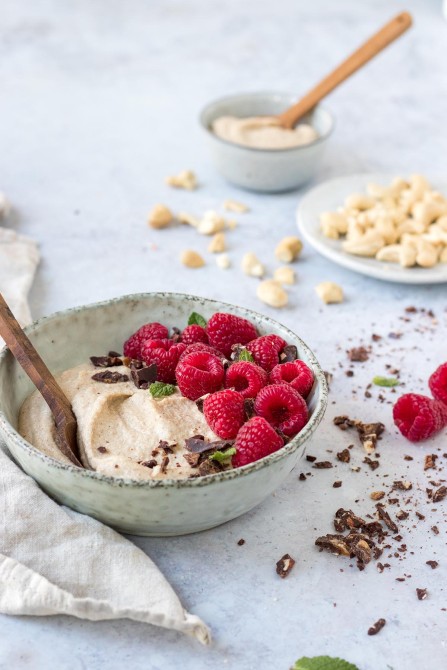 Cashewnuss Joghurt mit Himbeeren und Schokolade