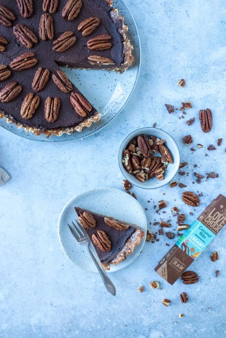 Für die Schokoladenschicht, lasse die Cashewkerne in einem Sieb abtropfen und gebe sie in die Küchenmaschine. Füge den Rohkakao, die Medjoul-Datteln, die Lovechock-Schokolade, das Kokosöl, das Wasser, den Vanilleextrakt, den Zimt und das Salz hinzu und mahle, bis die Masse cremig und glatt ist. Dies dauert etwa 7-10 Minuten.