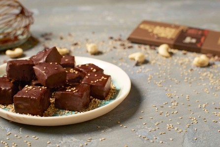 Ausgekühlte Cashewmasse in 2 cm große Würfel schneiden. Die restliche Schokolade hacken und über einem Wasserbad sanft schmelzen. Die geschmolzene Schokolade in ein kleines Glas füllen, die Nougatwürfel einzeln in die flüssige Schokolade tauchen und auf einem mit Backpapier ausgelegtem Blech abkühlen lassen. Solange die Schokolade gerade noch flüssig ist mit etwas Sesam bestreuen.