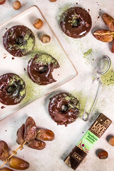 - Als kleines Extra kann man auch noch etwas Matcha-Pulver über den Donuts verteilen. Das schmeckt nicht nur lecker, sondern macht sie noch viel gesünder!