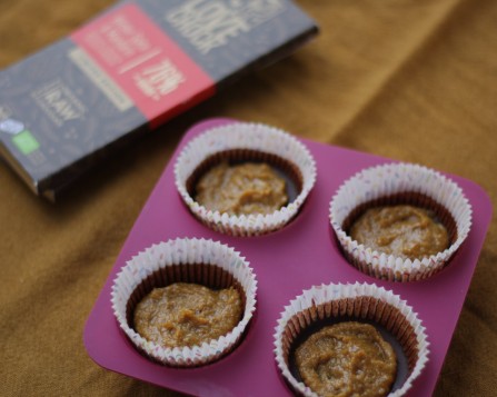 Schritt 2: Gieße die Hälfte der Schokolade in die Muffin-Formen und lasse sie im Kühlschrank aushärten.