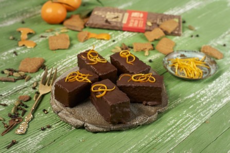 2 Tafeln Lovechock Winter Spice Mandarin grob hacken und über einem Wasserbad langsam zum Schmelzen bringen. Die Cake Bars in die flüssige Schokolade tauchen. Mit der kandierten Orangenschale dekorieren und auskühlen lassen.